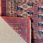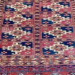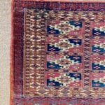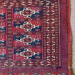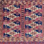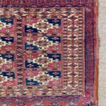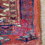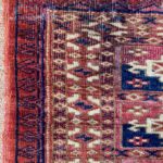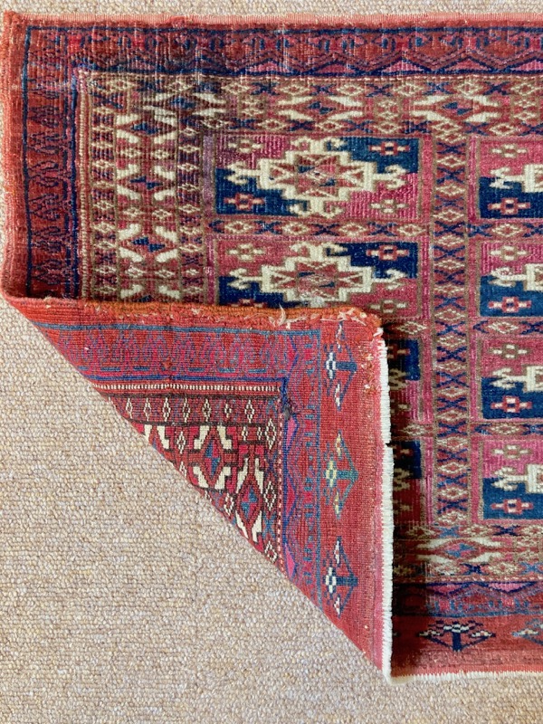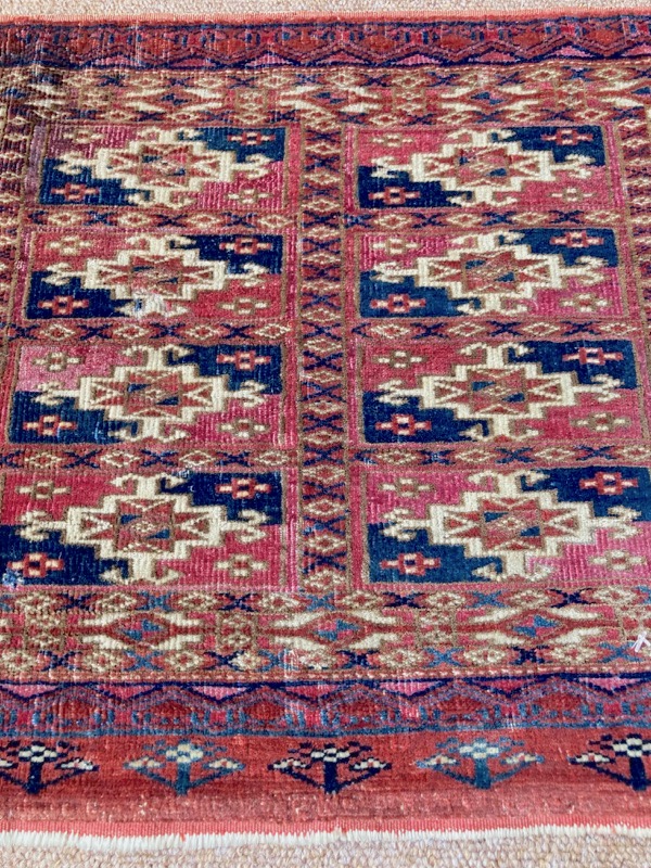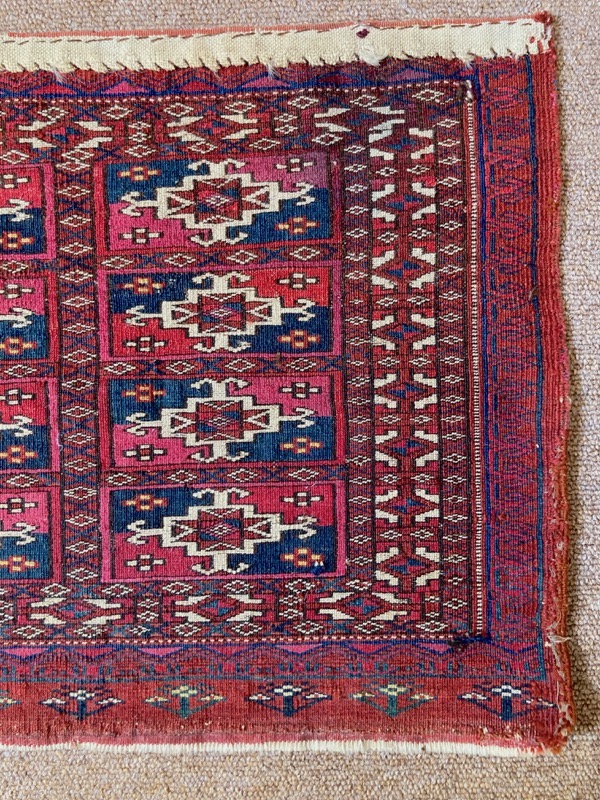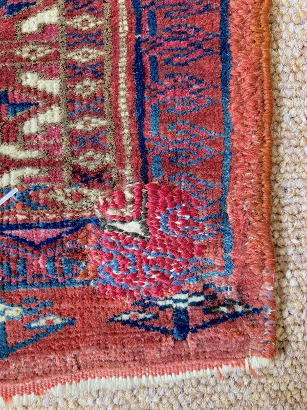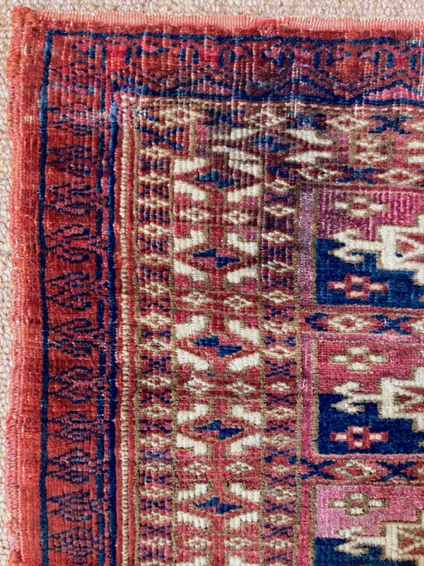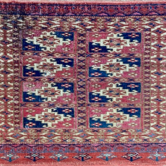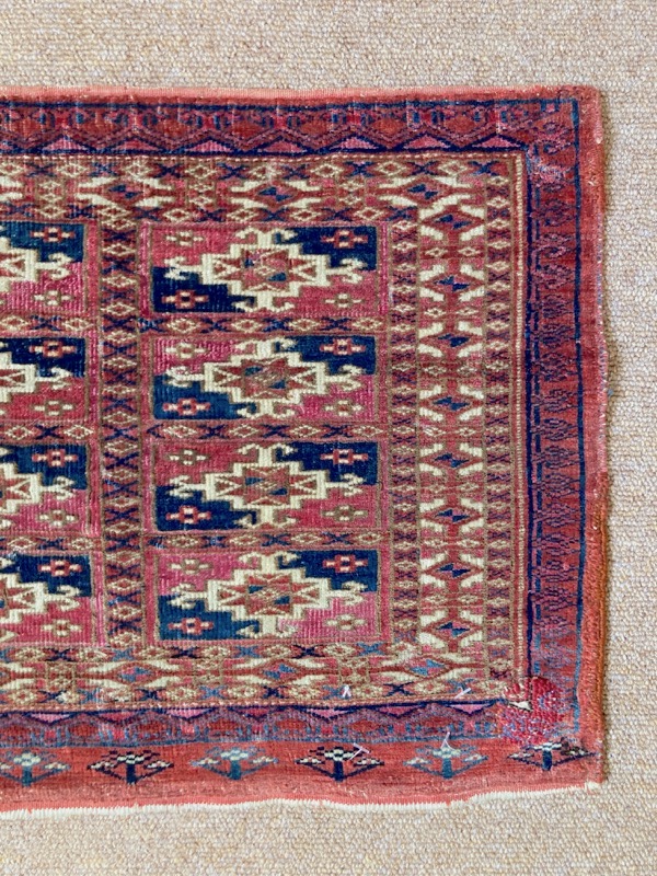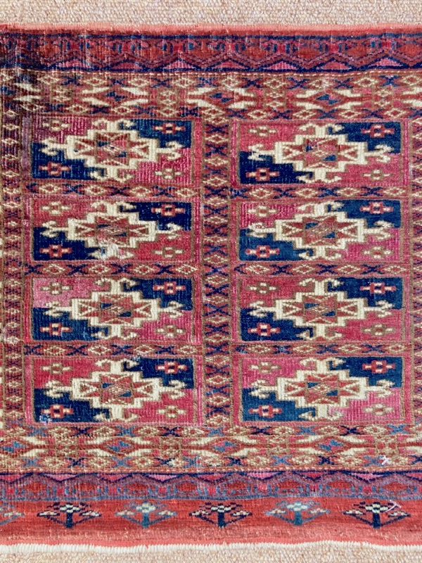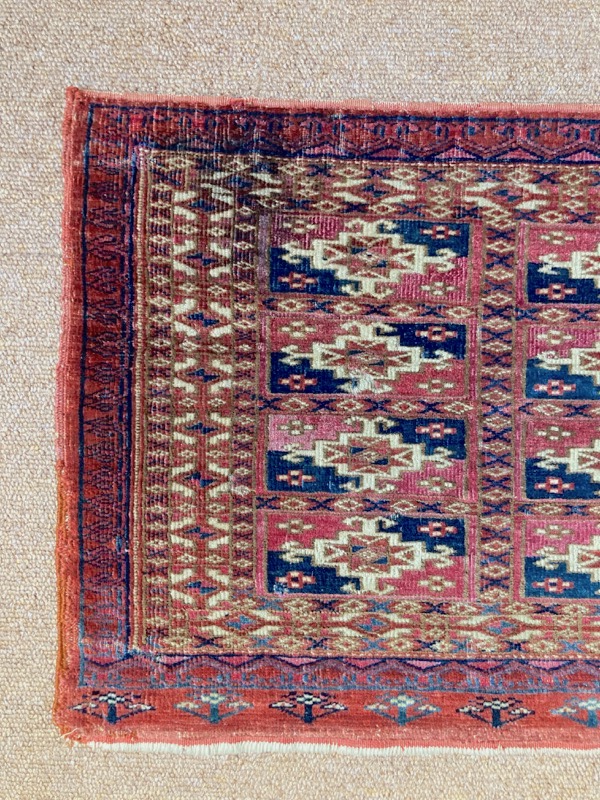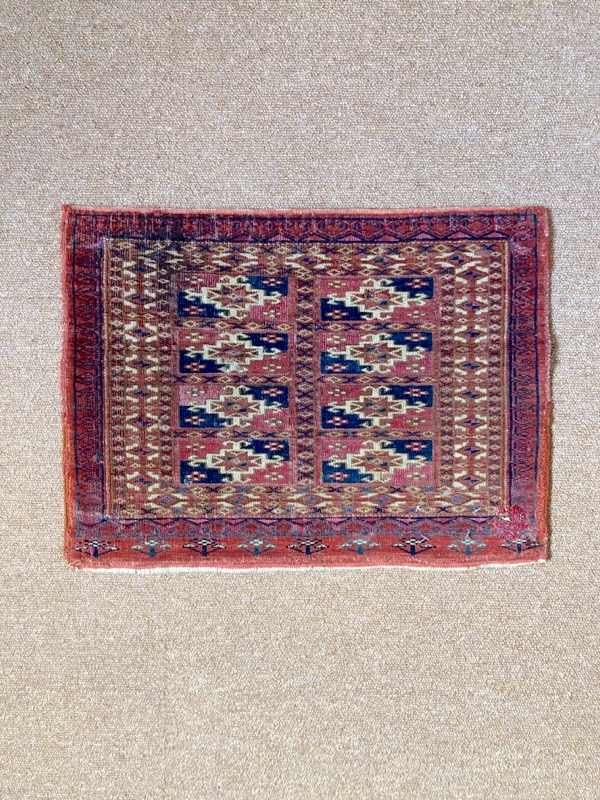 Late 19th century Tekke bag face, with an old original repair in the left hand corner. This format is unusual for Turcomen weavings, the ainu gul design more typical of mafrash pieces. Note the interesting heading panel and elem.