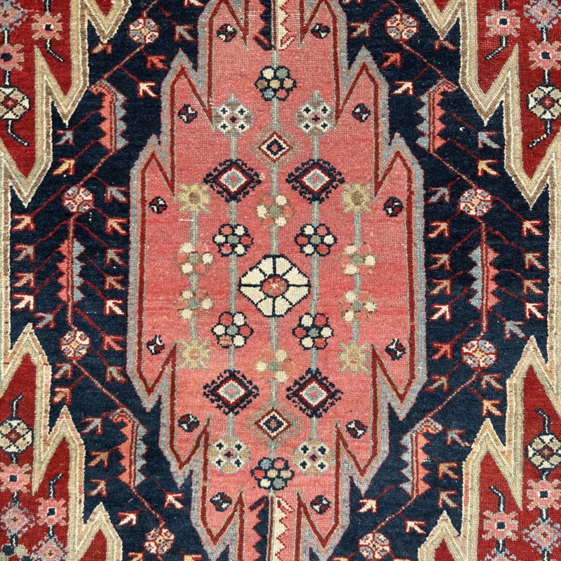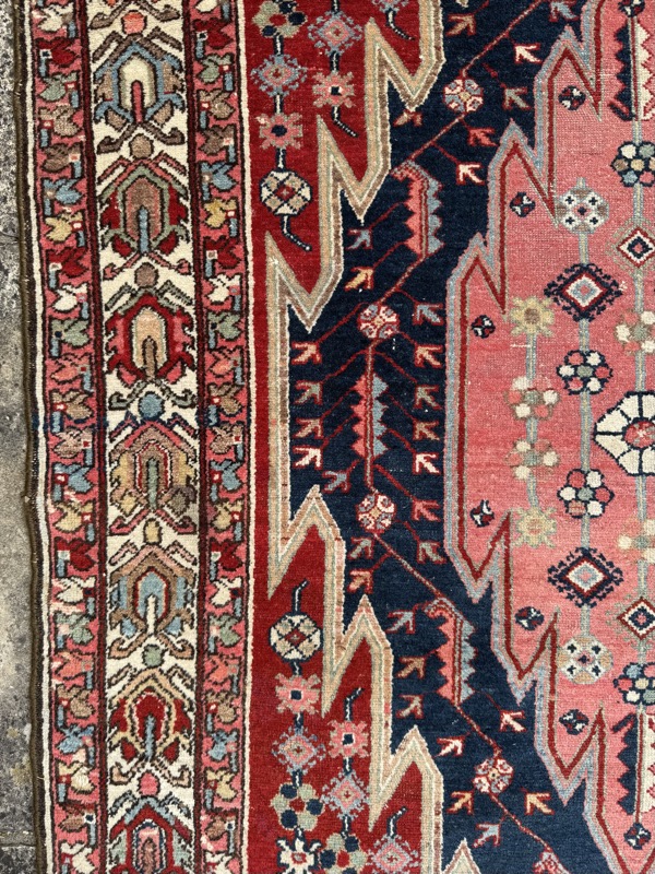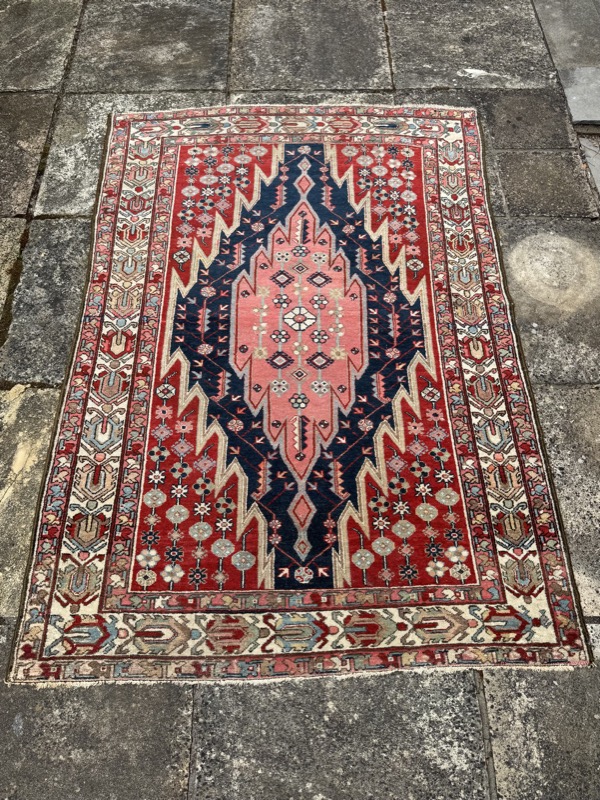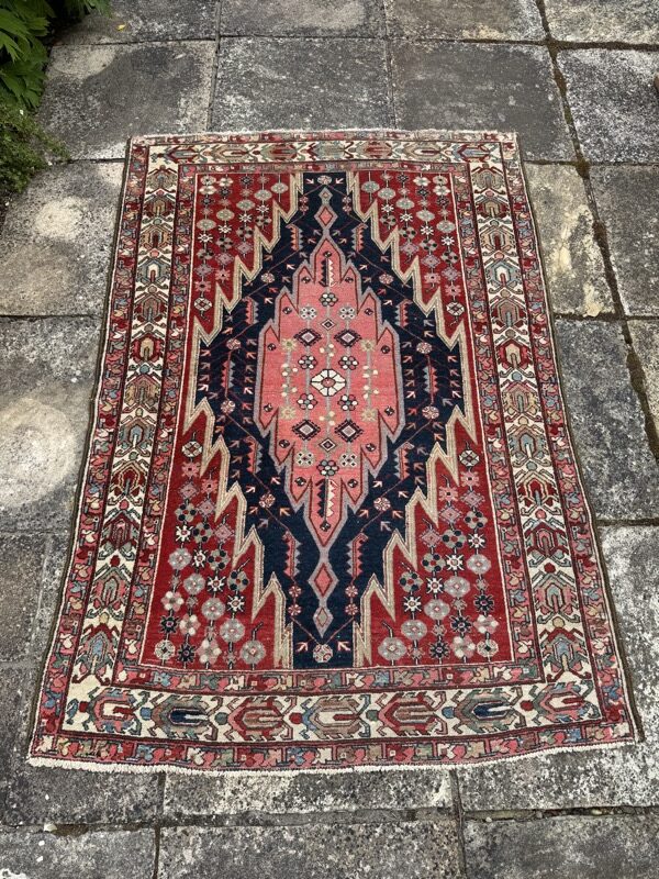 With its tell-tale typical design, Maslaghan rugs are very much sought-after. This 1930’s example has pleasing pastel colours, and is in tidy retail-ready condition.