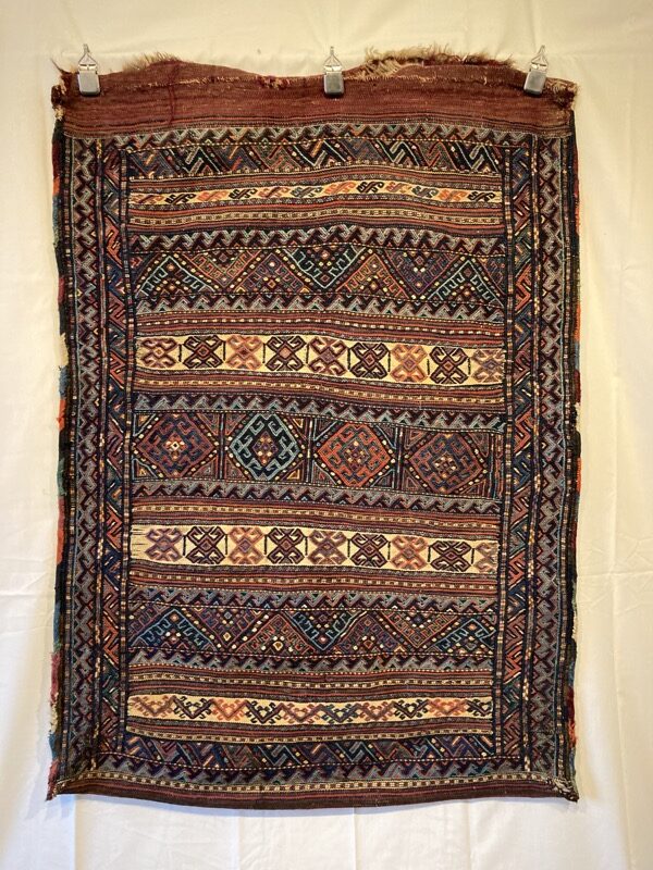 Catalogue ← BACK Kordi grain bag Description A complete Kordi grain bag, probably woven in the 1930s. With a wealth of motifs and great colours: would make a stunning cushion. C.f. “Kordi” W.Stanzer pp.214-216 Stock Code: 09829 Dimensions 112cm (44in) x 81cm (32in) Gallery Price: £290 Enquiry ← BACK Category:
