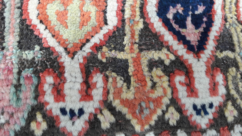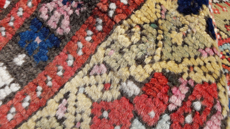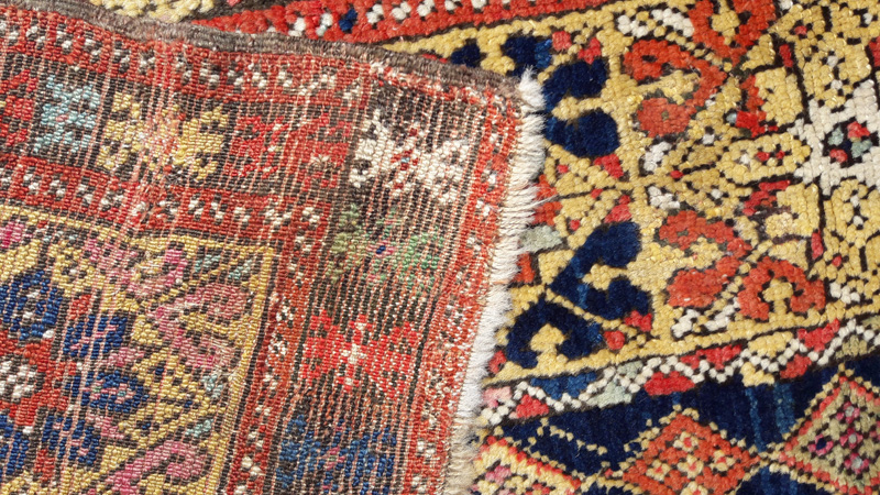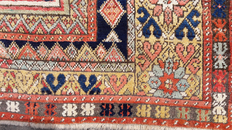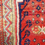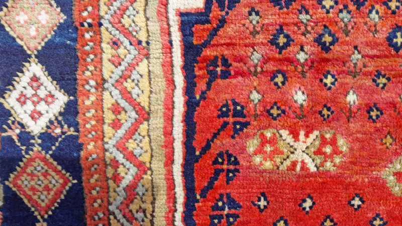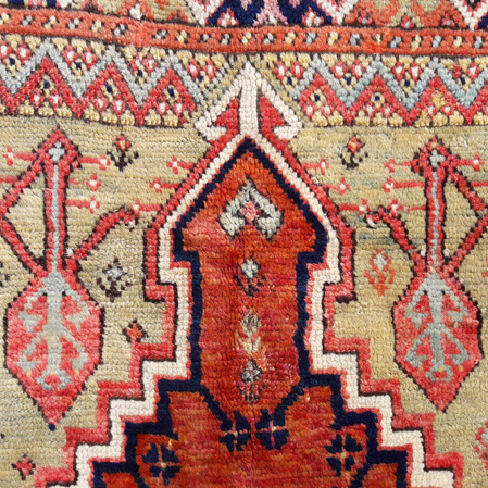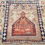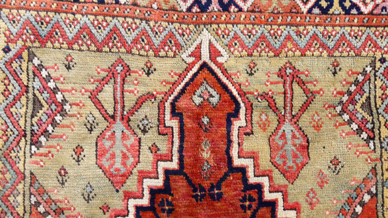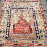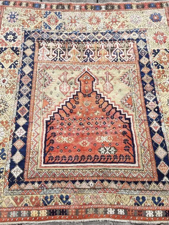 A striking large prayer rug from central Turkey, woven about 1875 but possibly earlier. The piece has been sensitively restored to retail/floor useable condition, with minor reweaves to field, selvedges and ends.
