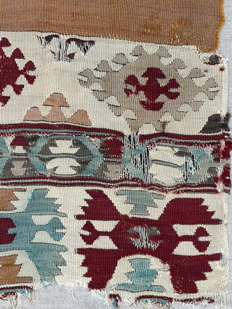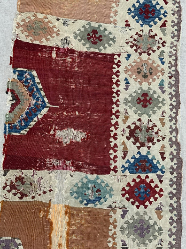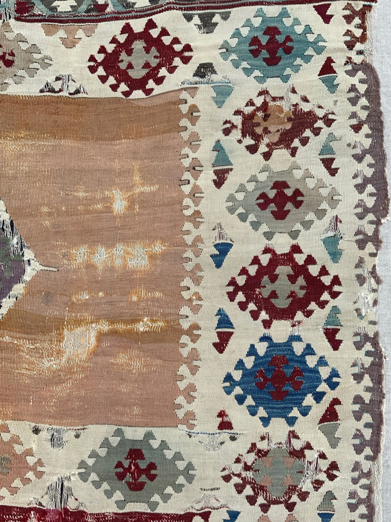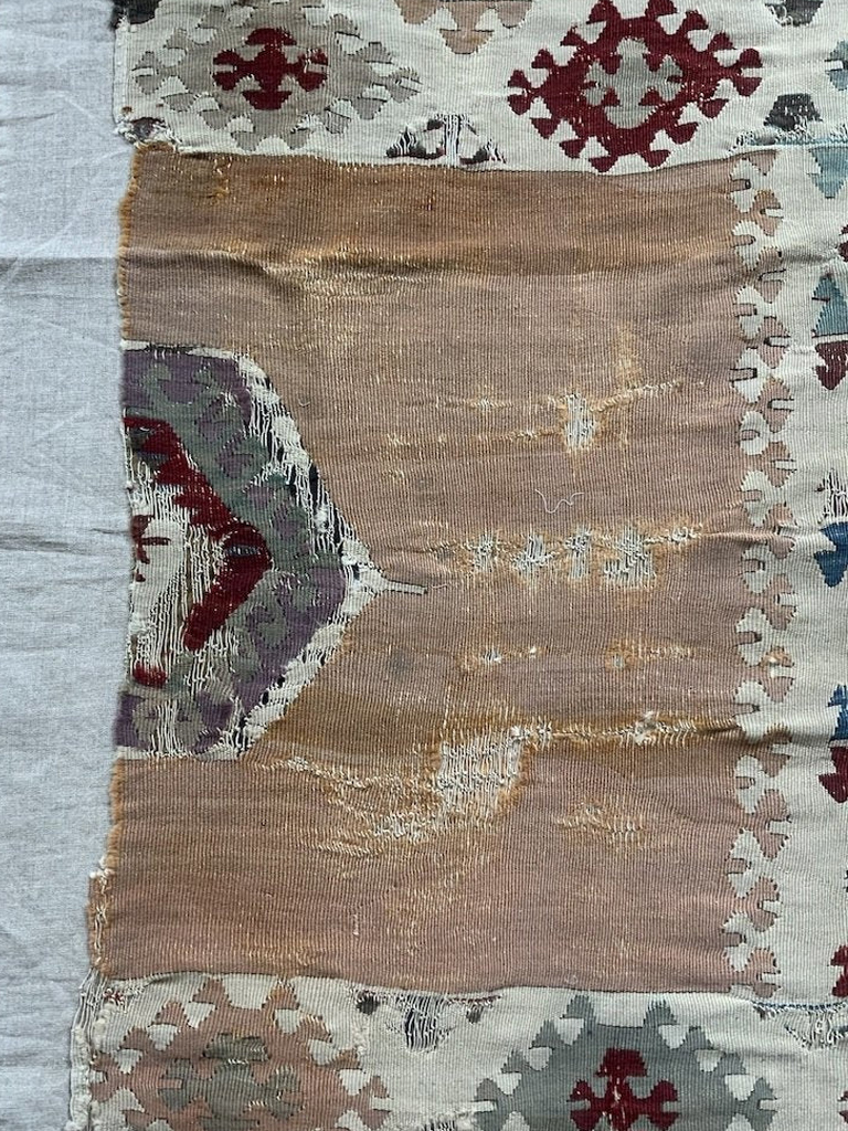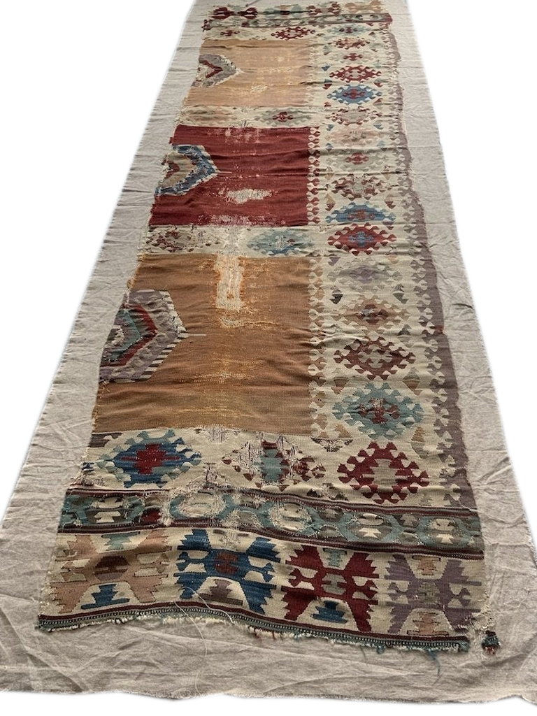 Catalogue ← BACK Anatolian mounted kelim Description Early 19th century kelim half, mounted on linen. Mount: 360 x 118cm Stock Code: 11106 Dimensions 335cm (132in) x 97cm (38in) Gallery Price: £400 Enquiry ← BACK Category: