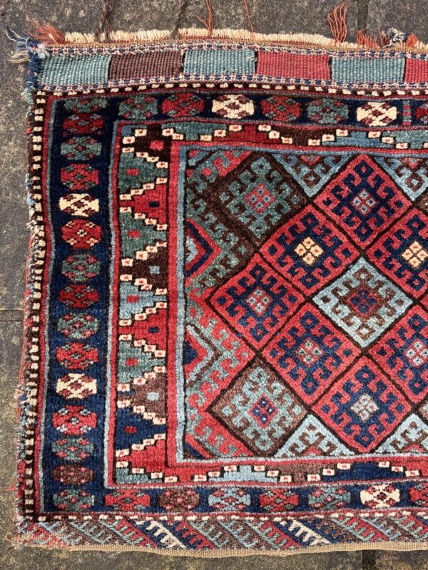 Catalogue ← BACK Kurdish Jaff bag Description Complete with unsewn back, this turn of the last century Jaf bag is in great condition, with strong saturated colours, and full pile. Stock Code: 11237 Dimensions 99cm (39in) x 74cm (29in) Gallery Price: £725 Enquiry ← BACK Category: